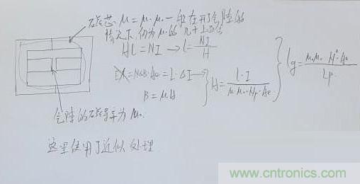 上面做了近似,近似所有的磁場能量都儲存在氣隙里面,因為磁芯的磁導(dǎo)率很高,氣隙的磁場強度是磁芯的幾時到幾百倍,所以,近似磁芯為磁路短路,磁回路長度近似為氣隙長度。