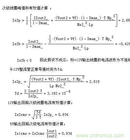上面是次級電流有效值的計算,斷續(xù)模式的,并且加入了次級電流連續(xù)或者斷續(xù)的判斷,(判斷這一步其實沒有必要,因為變壓器初級連續(xù),次級也連續(xù),初級斷續(xù),次級也斷續(xù)。)
