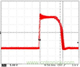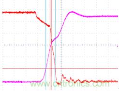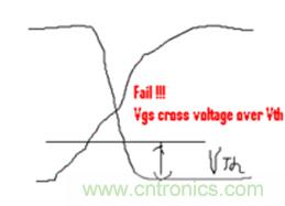 下面這種情況有非常多的人會忽視,甚至是一些比較有經驗的電源測試工程師。下面組圖四是下管打開,上管關閉時候的波形(圖4-1是示意圖,圖4-2示實際測試圖)。雖然沒有被同時帶起的情況,但是請注意上下管有交叉的現象,而且交叉點的電平遠高于MOS管規定的Vth值,這是個嚴重的shoot through現象。最直接的后果就是MOS管燒毀!