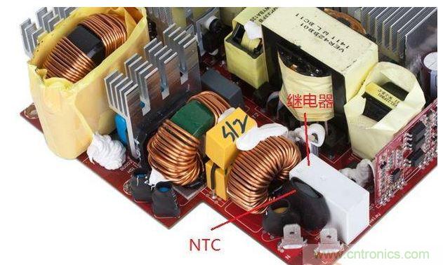 如圖5,一些電源會安裝負溫度系數熱敏電阻(NTCThermistor)和繼電器。安裝在這里的NTC的作用也是抑制電源接通瞬間的浪涌電流,保護電子設備。原理簡而言之就是“阻值隨溫度升高而降低”。舉個例子,假設上圖電源的NTC在“零電流通過/零功率”狀態下的阻值為20歐,當機器冷啟動時,瞬態電流讓NTC阻值急速下降至低于1歐,隨著后續持續電流的輸入,NTC持續發熱,維持在低阻值,功耗極低。