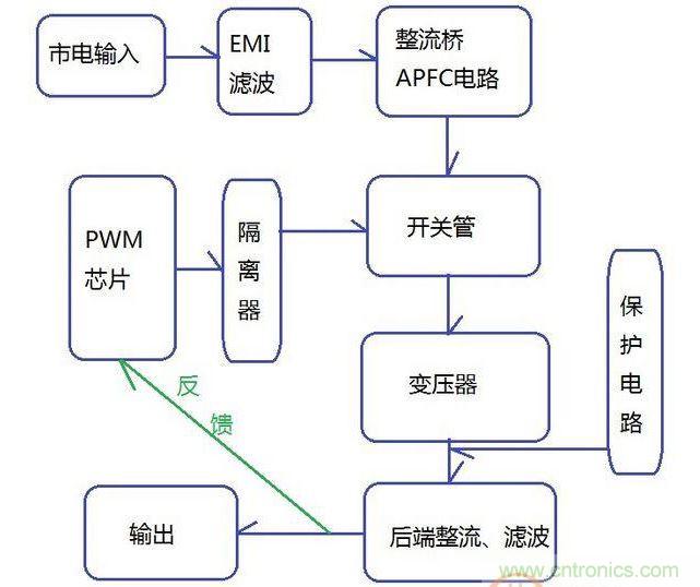 圖1是一個典型的雙管正激拓撲結構,肖特基整流、單路磁放大穩壓,由CWT代工。1是EMI濾波電路。2主要是APFC(主動式功率因數校正),主要包括整流橋、主動PFC電感和升壓電容、PWM芯片。3主要包括變壓器和磁放大電感、待機驅動芯片。4是后端整流,二次側(輸出端)電路。兩條散熱片上,2和3間釘著開關管,3和4間釘著整流管。圖上沒框住的還有三顆光耦,沒特意標出的有保護電路、輸出線材、背部元件、電路板等。大體示意圖表示如圖2: