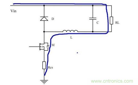 接下來的開關(guān)周期內(nèi),電感通過二極管D續(xù)流,如圖3所示。這就出現(xiàn)了一個(gè)問題,此時(shí)的電流不再流經(jīng)開關(guān)管,控制電路無法知道電流下降到何種程度了。