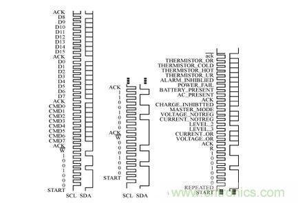 從圖4可見(jiàn):89C51與MAX1647通信的開(kāi)始條件是SDA端口為下降沿,同時(shí)SCL端口為高電平;MAX1647的 WRITE-WORD協(xié)議為0b00010010(0b表示二進(jìn)制),或者可表示為0x12(0x表示十六進(jìn)制);READ-WORD協(xié)議則可表示為 0b00010011或者0x13。另外,CMD0~CMD7代表具體的命令,D0~D15表示數(shù)據(jù)位。幾個(gè)常用的WRITE-WORD協(xié)議命令:ChargerMode()命令,命令代碼為0x12,主要用于清零和復(fù)位;ChargingVolage()命令,命令代碼為0x15,主要用于電壓預(yù)置;ChargingCurrent()命令,主要用于電流預(yù)置,命令代碼為0x14,即CMD7~CMD0的數(shù)據(jù)為00010100,16位二進(jìn)制數(shù)值由D15~D0組成表示Io的電流值,單位為mA。當(dāng)端子SEL與AGND短接時(shí),電流Io的最大預(yù)置值為1.023A;如果讓端子SEL懸空,則 Io的最大預(yù)置值為2.047A;當(dāng)端子SEL與VL短接,則Io的最大預(yù)置值為4.095A。MAX1647提供兩個(gè)電流源給負(fù)載供電:一個(gè)來(lái)自?xún)?nèi)部的線性電流源IOUT,一個(gè)是開(kāi)關(guān)電路提供的電流。IOUT提供1mA~31mA的電流(步長(zhǎng)為1mA)。例如,當(dāng)Io最大預(yù)置值為4.095A時(shí),數(shù)據(jù)位 D11~D6對(duì)應(yīng)為6位電流預(yù)置DAC的DA5~DA0位;數(shù)據(jù)位D4~D0對(duì)應(yīng)輸出電流IOUT的I4~I(xiàn)0,表示IOUT線性電流源二進(jìn)調(diào)整數(shù)。注意任何時(shí)候DAC位被置位,線性電流源被調(diào)整至滿(mǎn)幅(31mA)。AlarmWarning()命令,命令代碼為0x16,主要用于保護(hù)設(shè)置;ChargerStatus()命令,命令代碼為0x13,主要用于返回溫度傳感器以及MAX1647的內(nèi)部信息,這些信息暫存D15~D0位中。