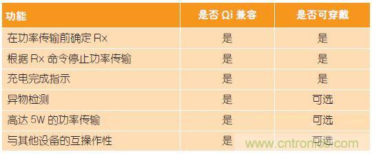 大多數Qi兼容功能的使用并不影響尺寸或性能。異物檢測(FOD)功能是一項可選功能,可防止功率傳輸到充電區的雜散金屬物體。在具有FOD功能的低功耗系統中,總輸出功率被減小50%以上。隨著充電區域的縮小,物體進入該區域,并被加熱至出現問題的可能性也大大降低。FOD功能的關鍵可能主要取決于可穿戴設備充電墊或充電底座的機械設計。表1總結了采用WPC-1.1 Qi標準時的一些主要可用功能,而這些功能在定制可穿戴應用時是可選的。