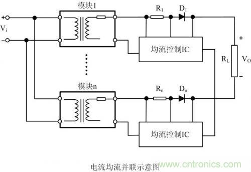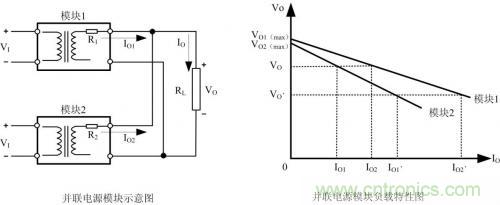 如果兩個模塊的參數完全相同時,即:VO1(max)= VO2(max)、R1=R2,則兩條負載特性曲線重合,能實現負載電流均勻分配。但在實際應用中,兩個具有相同容量的模塊,VO1(max)與VO2(max)、R1與R2的參數也不可能完全做到相同。從圖 2可以看出,由于輸出到負載RL的等效阻抗R1、R2很小,輸出電壓即便出現很小的差別也會引起輸出電流很大的變化。例如:當負載RL電流由IO= IO1+ IO2增大到IO、=IO1、+IO2、時,負載特性曲線斜率小的模塊1將承受大部分負載電流,模塊1將運行在滿載或過載限流狀態,影響模塊的可靠性。