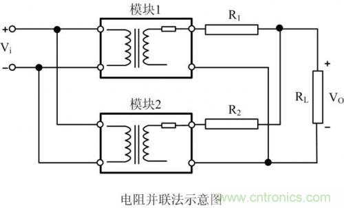 圖 3是一種采用比較多的電源并聯方案:電源輸出電阻并聯法。在兩組模塊輸出端先分別串接電阻R1、R2,然后再并聯。此種方案主要利用電阻R1、R2上的線性電壓,使得兩組模塊盡量達到負載均衡目的,避免負載特性曲線斜率小的模塊承受大電流輸出。此并聯方案成本低,但只適合在精度要求不高、輸出功率不大的場合