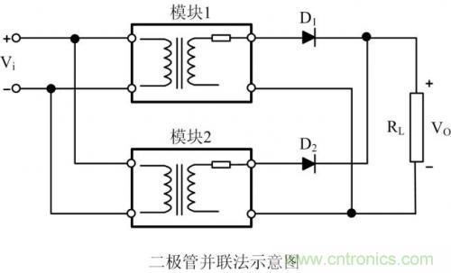 圖 4是電源輸出二極管并聯法,在兩組模塊輸出端先分別串接二極管D1、D2,然后再并聯。此種方案與電源輸出電阻并聯法原理相同,優點在于可以利用二極管防止不同電源模塊的輸出電流逆流到另外一個模塊,形成內環流。