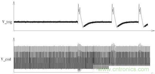 另外,在參考圖7中,V_coil上有間距不等的觸發訊號,經由設計解調電路V_trig解析出清楚觸發訊號,而TX_U1在接收此連續觸發訊號組合進行解碼之動作。