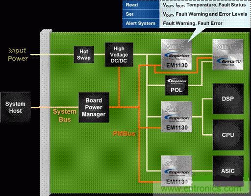 (2)另一常見(jiàn)的系統(tǒng)電源要求是能夠進(jìn)行遠(yuǎn)程監(jiān)視,對(duì)電源各參數(shù)進(jìn)行實(shí)時(shí)監(jiān)視、故障報(bào)警和相應(yīng)調(diào)節(jié)。而最簡(jiǎn)單、最便宜、最緊湊的方式是使用集成了遠(yuǎn)程監(jiān)視功能和相應(yīng)的通信總線(xiàn)的電源調(diào)節(jié)器。通過(guò)智能電壓ID(SmartVID)特性,Altera的Arria 10 FPGA和SoC通過(guò)PMBus接口,確定與Enpirion電壓調(diào)節(jié)器系統(tǒng)之間所需的VCC電壓和通信,將內(nèi)核電壓軌盡可能動(dòng)態(tài)調(diào)整到最小,而不會(huì)犧牲系統(tǒng)性能。同時(shí),支持PMBus的Enpirion的ED8101P0xQI單相數(shù)字控制器,與ET4040QI大電流電源配對(duì)使用,可實(shí)現(xiàn)對(duì)FPGA的多種遠(yuǎn)程監(jiān)視和低功耗特性。