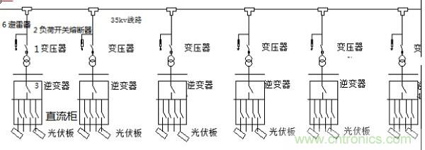 2、交流電經100KVA變壓器1,直接升壓至35KV,變壓器、高壓隔離開關熔斷器、逆變器、避雷器等裝在一套箱變內。