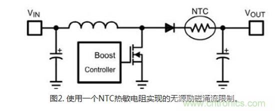 最簡單的限流機制是采用一個負溫度系數 (NTC) 熱敏電阻(圖2)。由于在冷卻時出現高阻抗,NTC在開始啟動時限制勵磁涌流。其自身功率耗散所導致的自發熱可使阻抗下降,從而能夠使更多的電流流過。這個方法的優勢在于簡便易行且成本低廉。然而,在惡劣條件下使用這個方法會帶來某些缺點。比如,在汽車發動機艙等溫度大幅變化的環境內,會出現使NTC初始阻抗降低的高環境溫度;此外,如果不仔細管理整個環境運行條件,就會導致過多的勵磁涌流。如果出現重新啟動的情況,NTC器件溫度也許會在下一次加電之前尚未冷卻。在輸出電容完全放電時,由于散熱速度較慢,NTC對于勵磁涌流的限制會變到最低。此外,如果負載出現短路故障,NTC將無法限制比所選標稱運行條件高的電源電流。最后,NTC方法對于單一功能保護有效,但是由于使用的是無源組件,這個方法也會受到某些限制。