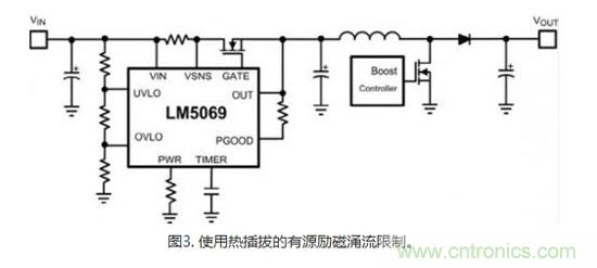選擇像MOSFET這樣的主動限制裝置需要一個勵磁涌流限制控制器的控制電路,它也被稱為熱插拔控制器或電子熔絲。這是一個位于升壓控制器之前的附加集成電路 (IC),很多此類的控制器(圖3)特有包含電流和電壓環路的可編程涌入限制,旨在確保MOSFET保持在安全工組區 (SOA) 內的同時,控制涌入率。SOA用于監視維持關鍵保護器件的長期可靠性。此外,涌入控制器會具有兩個電流閥值:一個用于規范涌入限制,第二個是在嚴重過流情況下用于完成斷路器功能。這種方式的一個明顯優勢就是你能夠實現它的先進保護特性;然而,通常來說,這個解決方案的成本和復雜度要高于無源方法。