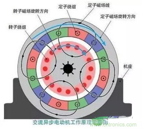 交流電動機的工作原理:通電繞組在旋轉磁場里轉動。