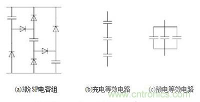 對于輸入輸出電壓相差很懸殊的情形,DC-DC變換器一般需要采用脈沖隔離變壓器來滿足電壓變比的要求。還可以采用如圖3所示的串并電容組合結構(SP)[7,8]構成工作儲能電容器,它具有串聯(lián)充電和并聯(lián)放電的特性,因此在失去交流電源而由工作儲能電容器放電維持工作期間,串并電容組合結構實際上起到了降壓的作用。通過選取恰當階數(shù)的串并電容組合結構,就有可能在DC-DC變換器中不需要采用隔離變壓器也能滿足電壓變比的要求。