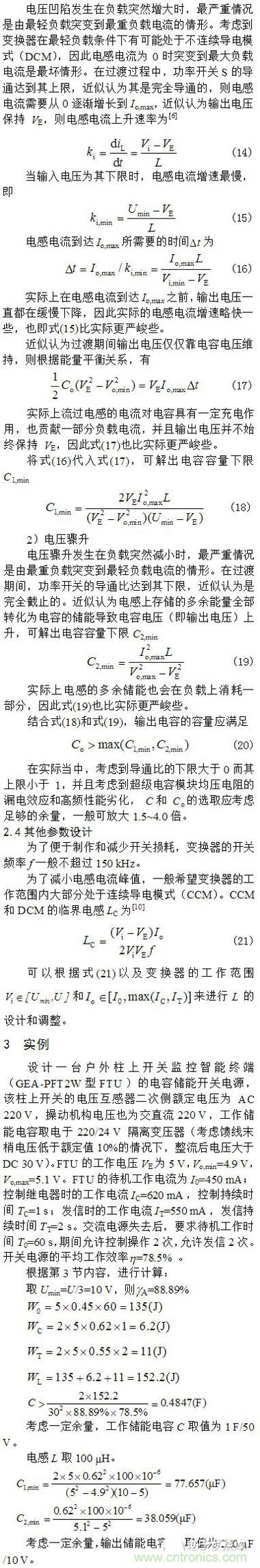根據(jù)能量平衡關系,分析了負載突然增大和負載突然減輕情況下的最嚴重電壓凹陷和電壓驟升,并得出輸出濾波電容容量的設計考慮。以一個具體的電容儲能FTU電源為例,詳細說明了電路參數(shù)的設計方法,并進行了實驗研究。實驗結果表明所設計的電容儲能備用電源能夠滿足在失去正常供電電源后自動化終端待機、操作和通信的需要,并且所進行的理論分析與實際情況相符。