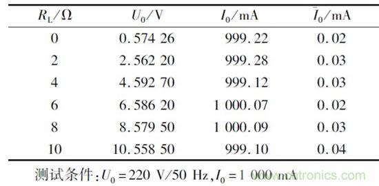 負(fù)載穩(wěn)定性測(cè)試條件為U0 =220 V/50 Hz,I0 =1000 mA,測(cè)試數(shù)據(jù)如表2 所示,其中負(fù)載穩(wěn)定度是指一定的工作情況下,負(fù)載變化引起的輸出電流變化。測(cè)試數(shù)據(jù)表明負(fù)載在0 ~10 贅變化時(shí),輸出電流最大偏差為0. 99 mA,紋波電流小于0. 05 mA.