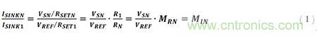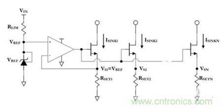 最終MOSFET(金氧半場效晶體管)源電壓VS以及RSET電阻決定著各柱上的灌電流(sink current);通過去除來自外部電流沉柱的反饋(即所有N》1),已失去對VSN的直接控制。因此,RSETN必須精心選擇以生成預(yù)期的任意第N個(gè)柱的灌電流,即ISINKN。仔細(xì)觀察上面的圖1,很容易得出定義偏置網(wǎng)絡(luò)第N個(gè)柱電流與第1個(gè)柱電流的比值的等式︰