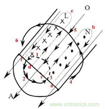 變壓器的鐵損主要由變壓器渦流損耗產生,如圖3所示,給線圈加載高頻電流時,在導體內和導體外產生了變化的磁場垂直于電流方向(圖中1→2→3和4→5→6)。根據電磁感應定律,變化的磁場會在導體內部產生感應電動勢,此電動勢在導體內整個長度方向(L面和N面)產生渦流(a→b→c→a和d→e→f→d),則主電流和渦流在導體表面加強,電流趨于表面,那么,導線的有效交流截面積減少,導致導體交流電阻(渦流損耗系數)增大,損耗加大。