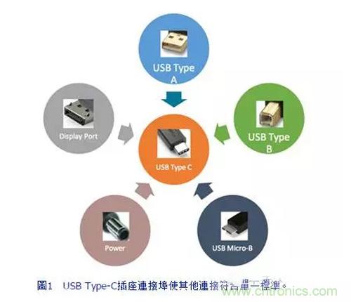 USB Type-C不但能夠減少使用的連接線,還可確保裝置之間順利協作,為使用者和消費者的生活帶來相當大的便利性,但卻也會為設計者和開發人員帶來麻煩。目前,市面上已有很多類型的USB連接埠和連接線,包括Mini、Micro、Type-A、Type-B等。繁多的種類很容易造成混淆,例如行動電話的連接埠與筆記型電腦的連接埠不同,而筆記型電腦的連接埠又和數位相機的連接埠不同。USB Type-C 將大部分的連接縮減成單一標淮(圖1),可涵蓋所有裝置并提高可用性。USB Type-C可支援多個通訊協定,并且可向后相容于USB 2.0。監視器、耳機、充電器以及鍵盤等幾乎所有配件都能使用USB Type-C與電腦、平板電腦和智慧型手機等裝置進行通訊。