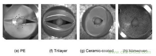 穿刺強度實驗發現,干法工藝制備的PE隔膜和三層復合隔膜會在沿著縱向的方向上出現一個較長的裂縫,而對于濕法工藝和無紡布工藝隔膜,失效多數只出現在局部,并且呈現圓形破口。