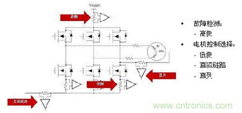 如圖1所示,基本上有三種不同的方法來測量三相電動機驅(qū)動系統(tǒng)中的電流:低側(cè)、直流鏈路和直列測量。圖1所示的是傳統(tǒng)三相PWM逆變器,該逆變器使用三對功率MOSFET(絕緣柵雙極晶體管IGBT也很常見)來驅(qū)動直流電動機。該圖還包括高側(cè)電流感應,其通常在顯著錯誤情況下使用,比如接地電路短路的情況。