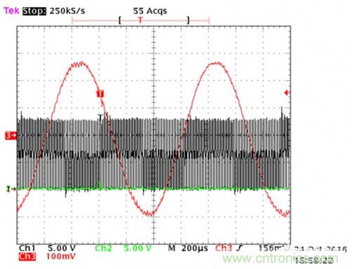 直列式電流感應方法看似是最合理的,因為這是最終要測量的電流。但這種方法存在一個問題。驅(qū)動MOSFET或IGBT的PWM信號對電流感應放大器造成嚴重破壞。感測電阻處的共模信號從電源電壓被驅(qū)動到接地,具有非常快速的瞬態(tài)開關特性,而電流感應放大器試圖測量感測電阻本身的小差分信號。圖2是由PWM逆變器產(chǎn)生的正弦相電流(紅色波形)的示波器截圖。這種情況下,PWM頻率為100兆赫(MHz),由LMG5200 GaN半橋功率級提供(更多詳細信息,請參見底部的TI設計)。需要注意的是,快速開關信號是直列式電流感應放大器測量相電流時所接收的信號。這就像在有颶風的情況下,當杯子在海上漂浮,而試圖測量杯中液體一樣。難怪大多數(shù)設計師會考慮使用低側(cè)感應!下面我們將介紹另外一種方法。