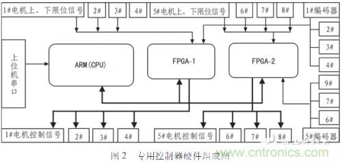專用控制器由arm(LPC2214)、fpga(EP2C5T144C8)、驅動器接口電路、編碼器接口電路、限位檢測電路和電源電路等組成,如圖2為一個八軸電機控制器的硬件組成圖。arm通過串口實現與上位機之間的通信,解析從上位機獲得的控制指令,并通過fpga產生相應輸出信號給驅動器接口,驅動器接口外接驅動器。編碼器信號作為位置反饋信號同編碼器接口相連,形成位置環反饋。限位信號作為安全檢測信號同限位檢測接口相連,為整個系統添加一道安全保障。