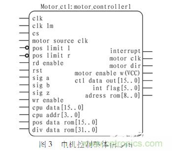 專用控制器在完成整個控制的過程中,arm只負責指令解析、控制指令發送、實時數據上傳等任務,fpga才是多軸專用控制器的核心。通過Verilog HDL語言在fpga內部實現了加減速曲線、編碼器信號辯向及四細分、絕對位移記錄等功能。圖3為電機控制的整體輸入、輸出信號圖,通過片選信號CS、讀有效信號rd_enable、寫有效圖信號wr_enable進行電機通道選擇。圖4給出了1#通道控制的fpga內部邏輯示意圖,下面將逐一對各主要模塊進行詳細介紹。
