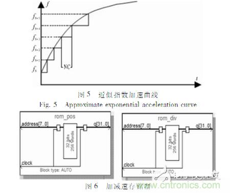 為了更有效、更理想地控制電機的運行,在fpga內部設計了加減速曲線模塊。文中采用了一種近似指數加減速曲線的方法,如圖5為近似指數加速曲線,減速曲線與之對稱。速度等距分布,那么在該速度級上保持的時間不一樣場。為了簡化,用速度級數N與一個常數C的乘積去模擬并且保持的時間用不熟來代替。因此,速度每升一級,電機都要在該速度級上走NC步(其中N為該速度級數)。