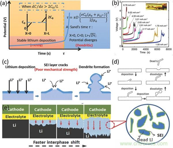 LMBs中鋰離子的行為與LIBs中鋰離子的插入/脫嵌行為完全不同。通常,在充電期間,鋰離子從外部電路獲得電子,然后以金屬-鋰顆粒的形式直接沉積在負極表面或下方。如果不對體系進行任何修飾,就會在鋰負極的頂部形成枝晶狀圖案。為了揭示鋰沉積行為、負極形態和界面的演變,各研究小組通過計算或高級表征技術從不同方面提出了相關模型。