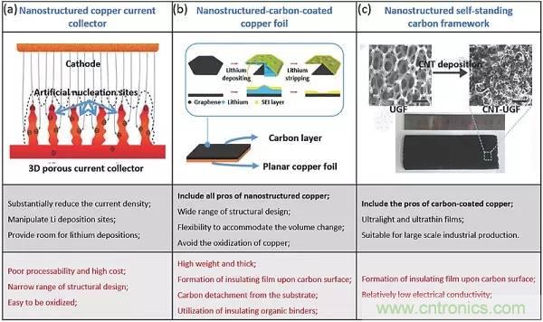 鋰粉末和表面改性的鋰箔可以作為平面鋰箔的替代物,以延遲枝晶的產生。負極的表面積大大增加以提供相當大的沉積位置,從而在一段時間內抑制枝晶生長。然而,鋰箔的表面狀態和粉末之間的邊界不會持續很長時間,并且整個箔在長時間循環中會變成隨機分散的鋰微結構的聚集體。相比之下,集流體(CCs)方法取得了較好的表現,傳統銅箔被納米結構化的材料代替。之后為了避免納米結構銅的缺點,開發了碳涂覆的銅箔,這些碳涂層都貢獻了更好的電化學性能,這與其優異的導電性、高比表面積和合適的孔徑/體積比具有密切的關系。與納米結構或碳涂層銅箔相比,自支撐碳膜本身可直接作為CCs,能夠避免有機粘合劑或碳脫落產生的導電性所帶來的不利影響。