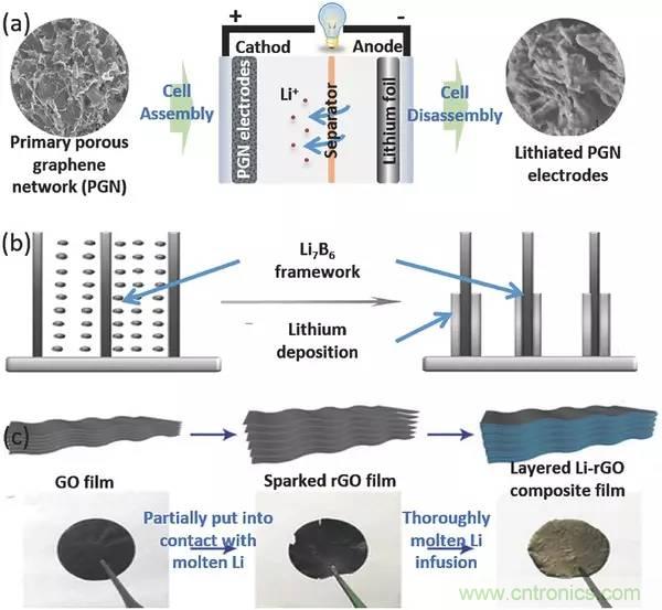由于不存在鋰源,上述三種類型的CCs(即納米結構銅、碳涂覆銅、自支撐碳框架)不能直接用于LMBs中。在LMBs中需要額外的將鋰電沉積到這些CCs中并進行后續的電池拆卸過程。除了復雜性之外,這種組裝/拆卸過程可能引入雜質,引起副反應,并破壞負極的完整性。所以研究者又制造了含鋰合金,如Li-Mg、Li-B、Li-Sn等,并且在LMBs中使用時無枝晶形態。然而,高品質鋰合金難以制備,特別是具有特定納米結構的鋰合金。最近開發了熔融鋰浸液作為負載鋰的新技術。這種方法將傳統的加載過程從內部轉移到外部,在可控性、加載質量和CCs的選擇上更有優勢。