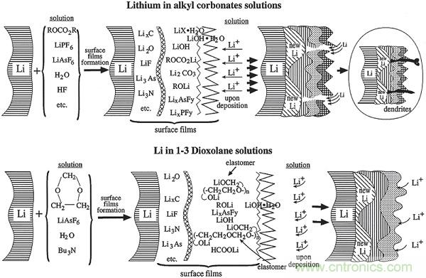 通常,本征SEI層由各種有機物(低聚物和聚合物)和無機物組成,其中有機部分賦予SEI層柔性以適應鋰沉積,而無機部分能夠實現快速的鋰離子傳輸。然而,無機碳酸鋰(Li2CO3)和鋰乙烯碳酸氫鈉(LEDC)作為兩個主要的SEI組分,在鋰沉積電位附近是熱力學不穩定的,并且允許循環中反應發生,而氧化鋰(Li2O)是唯一的熱力學和動力學穩定的組分,最里面的SEI層中的Li2O薄層是非常重要的,以避免在沒有氟化物源的情況下破裂。此外,化學和物理各向異性在SEI層內是常見的,同時導致異質鋰通量和不均勻沉積。沉積和溶解時,由無機離子香料組成的表面不能適應形態變化,因此可能會分解,導致高度不均勻的鋰沉積,使得枝晶形成。迄今為止,選擇合適的溶劑、鋰鹽和添加劑可以有效和高效地調節SEI層的性質。