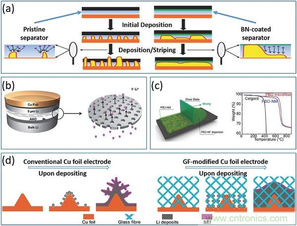 常規的非織造聚合物或微孔隔膜太脆弱以至于不能抵抗枝晶,對鋰沉積行為沒有顯著影響。這里開發了改進的中間層,以進一步保證電池的性能,這主要是通過與枝晶或鋰離子通量的相互作用。這里,中間層具有不同的功能,包括專門設計的分離器或附加的保護層,以彌補分離器的弱點。