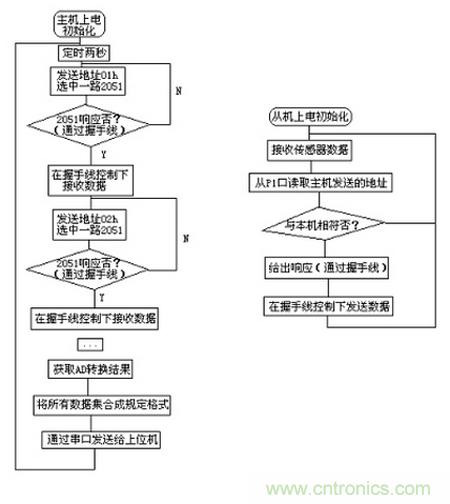 系統中51單片機作為主機控制著整個系統的動作并發起每次通信,每塊2051作為實時從傳感器獲取數據并在主機控制下完成通信。主機和各從機之間通過并口連接通信。主從機工作流程如下:
