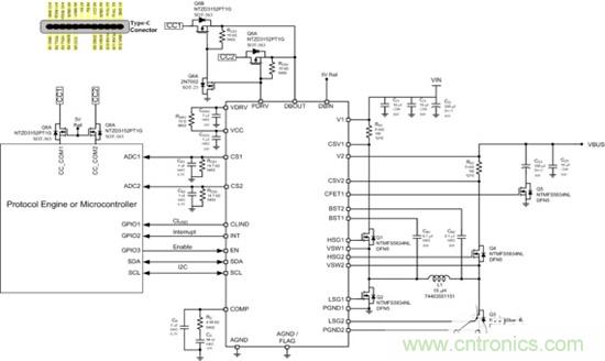 NCP81239支持寬輸入電壓范圍,提供從150 kHz至1.2 MHz動態可編程的開關頻率,集成4個MOSFET驅動,采用雙沿電流模式控制,支持輸出預偏置啟動,自適應死區時間控制防止直通,具有獨立的輸入和輸出電流檢測,輸出電壓(范圍0至20V)可以通過I2C 編程,集成過壓、欠壓、過流和精確的過載保護等完善的保護功能,同時還提供對5 V Vconn電源的保護。