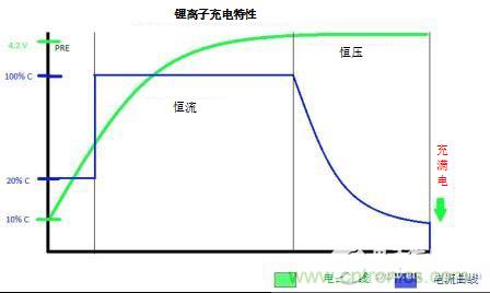 電池在充電時通常經歷兩個階段:恒定電流(CC)和恒定電壓(CV)。圖1所示為4.2V鋰離子(Li-ion)電池的典型充電曲線。當大部分能量從充電器傳輸到電池時,CC大致用于充電的前67%時間。在剩余充電時間的最后33%內,則是恒定電壓,以充分充電并保持電充滿。考慮到放電電流,并保持電池電壓完全充電,一些充電器在CV期間泵送小電流(也稱為涓流充電)。電池完全充電所需的時間取決于其容量和最大允許充電電流,是電池化學和環境溫度的函數。例如,如果您有一個容量為3000mAh,充電率為0.8C的鋰離子電池(其中C表示在一小時內為電池充電所需的電流,這是電池制造商建議延長電池壽命的默認電量),電池需要兩到三個小時才能完全充滿電。