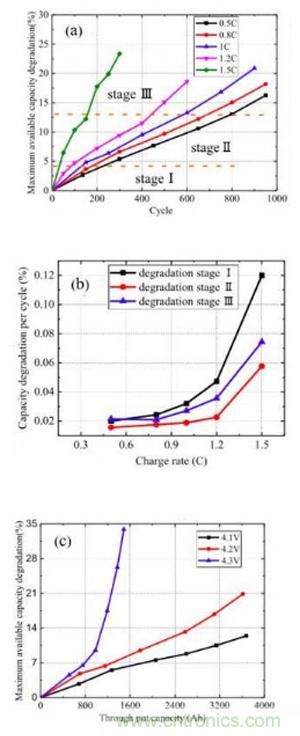從數據可以看到,隨著充電的倍率的加大,鋰離子電池的衰降速率也在快速增加,并且從曲線的斜率來看,電池的衰降速度存在三個不同的階段,前期衰降速度較快的階段(階段1),中間衰降速度較慢的穩定階段(階段2),和后期的衰降速率加速階段(階段3)。針對三個階段電池的衰降機理的研究認為,階段1可能是因為電池SEI膜生長需要消耗一部分Li+,因此衰降速度較快。在階段2隨著SEI膜結構的穩定,內部較為穩定,因此衰降速度較慢,在階段3隨著電池老化,開始發生活性物質損失,電極活性界面減少,導致電池對于電流十分敏感。圖C是針對不同的截止電壓對電池衰降速度影響的實驗,從實驗結果可以看到,當把充電截止電壓提高到4.3V時會導致電池的循環性能急劇惡化,降低充電截止電壓可以有效的改善電池的循環性能。