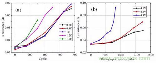 對電池的動態內阻分析如下圖所示,從圖a測試結果來看,當充電電流小于1C時,電池動態內阻隨著電池循環的變化趨勢幾乎時一樣的,但是當充電電流超過1C時,電池動態內阻增加速度會隨著充電速率的增加而快速增加。從圖b的測試結果來看,當充電截止電壓為4.3V時,電池動態內阻增加非常迅速表明高截止電壓會惡化電池的動力學條件,截止電壓為4.1V和4.2V時電池動態內阻增加較為緩慢。