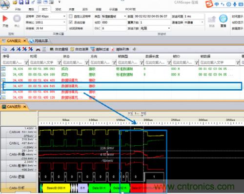 同時使用兩個CAN卡發送ID為000H數據為01020304050607H的CAN幀,CANScope做通信監控。首先,我們不勾選“總線應答”選項,使CANScope工作在僅監聽模式。實驗結果如圖6所示,出現的是應答定界符格式錯誤。