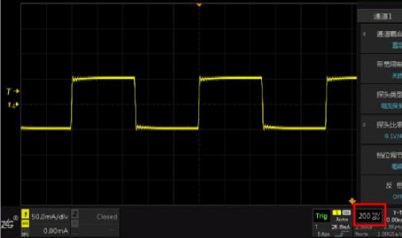 如圖3所示,在測試1KHz的電流方波時,探頭的方波響應是很好的,波形基本上沒有畸變,波形比較平坦,沒有發(fā)生傾斜等。