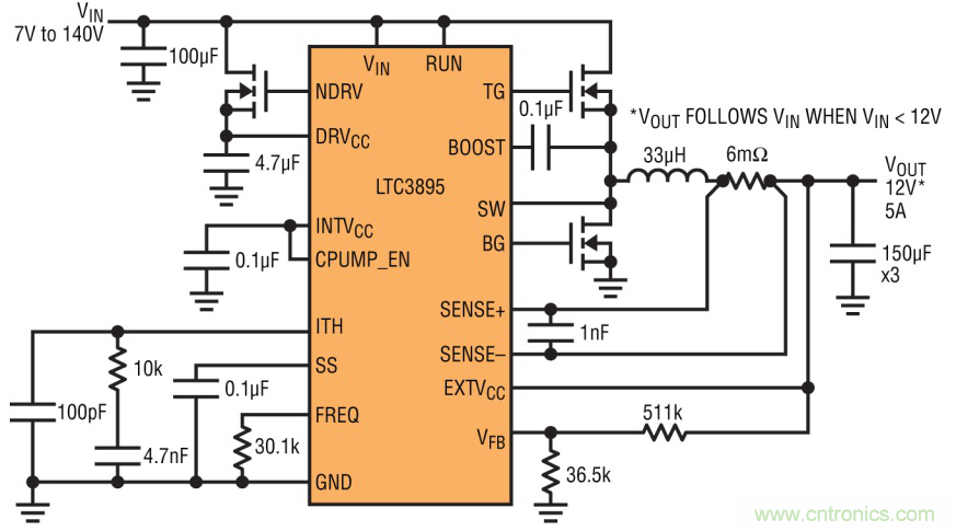 圖 5:LTC7813 原理圖 ~~ 一個級聯的升壓及降壓型單輸出控制器 IC