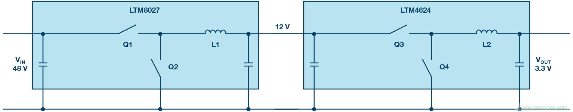 圖2 在2個(gè)步驟下電壓從48伏特轉(zhuǎn)換成3.3伏特,過程中還用到一個(gè)12伏特的中間電壓。