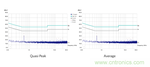 以下為 MAX17502 EMI 評估板的 EMI 測試結果,以非常好的裕量通過了 CISPR 22 標準 B 類要求。