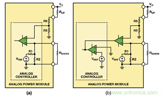 圖2. 利用 (a) 帶有可配置內部基準電壓的模擬控制器,或者(b) 帶有固定內部基準電壓的模擬控制器調整模擬電源模塊的輸出電壓