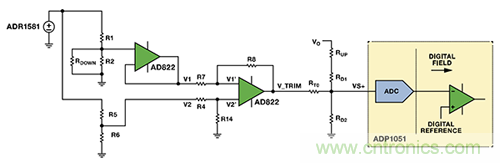 圖5中的電路具有兼容模擬向上或者向下調壓的功能。兩個電阻分壓器產生兩個基準電壓,其中一個基準電壓表示模擬控制器所需的輸出基準電壓,另一個表示內部基準電壓。利用一個電壓跟隨器來避免所需的輸出基準電壓與后續電路相互影響。利用AD822 FET輸入運算放大器,將所需的輸出基準電壓 (V1) 從模擬控制器的內部基準電壓 (V2) 中去除,得到所需的電壓差。此電路的線性放大增益確保了VTRIM足夠大,從而能對VVS+產生影響。