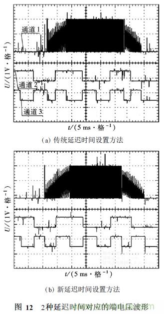 2種延遲時(shí)間設(shè)置方法對(duì)應(yīng)的實(shí)測(cè)端電壓波形(通道1)如圖12所示,通道2和通道3為過(guò)零點(diǎn)檢測(cè)波形,通道2的上升沿和下降沿對(duì)應(yīng)于過(guò)零點(diǎn),而通道3的上升沿和下降沿分別對(duì)應(yīng)過(guò)零點(diǎn)和換相點(diǎn).