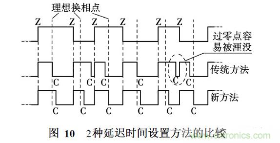 當(dāng)三相反電動(dòng)勢(shì)波形的間隔時(shí)間長(zhǎng)度不是理圖11 新的延遲時(shí)間設(shè)置方法想的120°電角度,過(guò)零點(diǎn)間隔時(shí)間不相等時(shí),采用新的延遲時(shí)間設(shè)置方法可以使換相更為準(zhǔn)確,換相點(diǎn)落在前后2個(gè)過(guò)零點(diǎn)的中間位置,過(guò)零點(diǎn)不容易被湮沒(méi),電機(jī)運(yùn)行不易失步,如圖10所示. 特別是在電機(jī)高速運(yùn)行時(shí),新方法提高了電機(jī)運(yùn)行的可靠性,實(shí)驗(yàn)很好地驗(yàn)證了新方法的可行性和有效性.