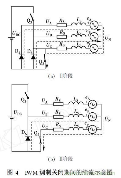 AC 和AB 區(qū)為A 相上橋臂開關(guān)PWM 調(diào)制階段. 以AC區(qū)為例,在PWM 開通期間, Q1 和Q2 導(dǎo)通, A 相繞組與直流側(cè)電壓的正極相連, 端電壓為UDC ;在PWM 關(guān)閉期間, Q1 關(guān)閉, Q2 導(dǎo)通,由于繞組阻抗呈感性, A 相下橋臂的反并聯(lián)二極管D4 導(dǎo)通續(xù)流,此時(shí)A 相繞組與直流側(cè)電壓的負(fù)極相連,端電壓為零.