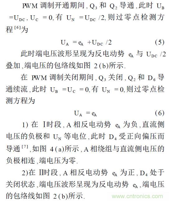 提出了在on _pwm 調(diào)制方式時(shí)的反電動(dòng)勢(shì)過(guò)零點(diǎn)檢測(cè)方法,采用內(nèi)置AD 的微控制器在PWM開通時(shí)檢測(cè)懸空相端電壓,軟件算法中使用簡(jiǎn)單的代數(shù)運(yùn)算,獲得準(zhǔn)確的過(guò)零點(diǎn)信號(hào). 目前,關(guān)于反電動(dòng)勢(shì)法的研究多集中在反電動(dòng)勢(shì)過(guò)零點(diǎn)的檢測(cè)電路方法和由濾液電路引起的相位誤差的消除或補(bǔ)償方法,但在準(zhǔn)確換相方面的研究尚不夠深入.
